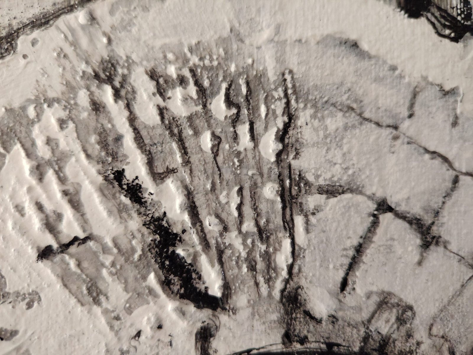 La paleta monocroma refuerza la presencia física de la obra y su relación con la luz. Blancos, negros y grises dialogan entre sí, permitiendo que las texturas y relieves se manifiesten de forma directa, sin distracción cromática. La superficie responde de manera distinta según el punto de vista y la iluminación, activando una experiencia sensorial cambiante.