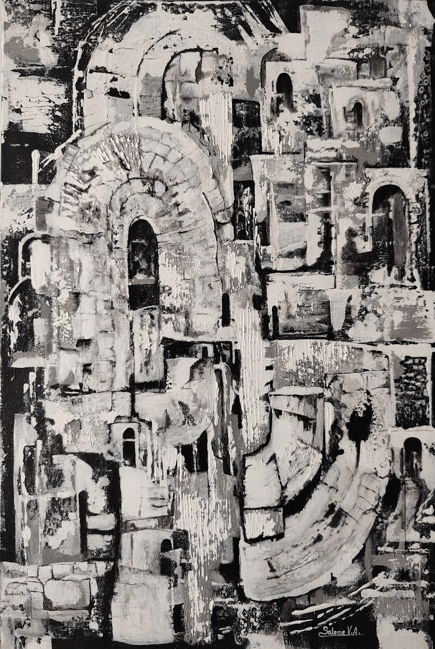 La repetición de arcos y estructuras sugiere interiores, pasajes y ruinas simbólicas. No se trata de una arquitectura reconocible, sino evocada: espacios que remiten a lo habitado, a lo erosionado por el tiempo y a la experiencia acumulada. La obra invita a una lectura pausada, abierta, donde cada fragmento puede interpretarse como tránsito, límite o refugio.