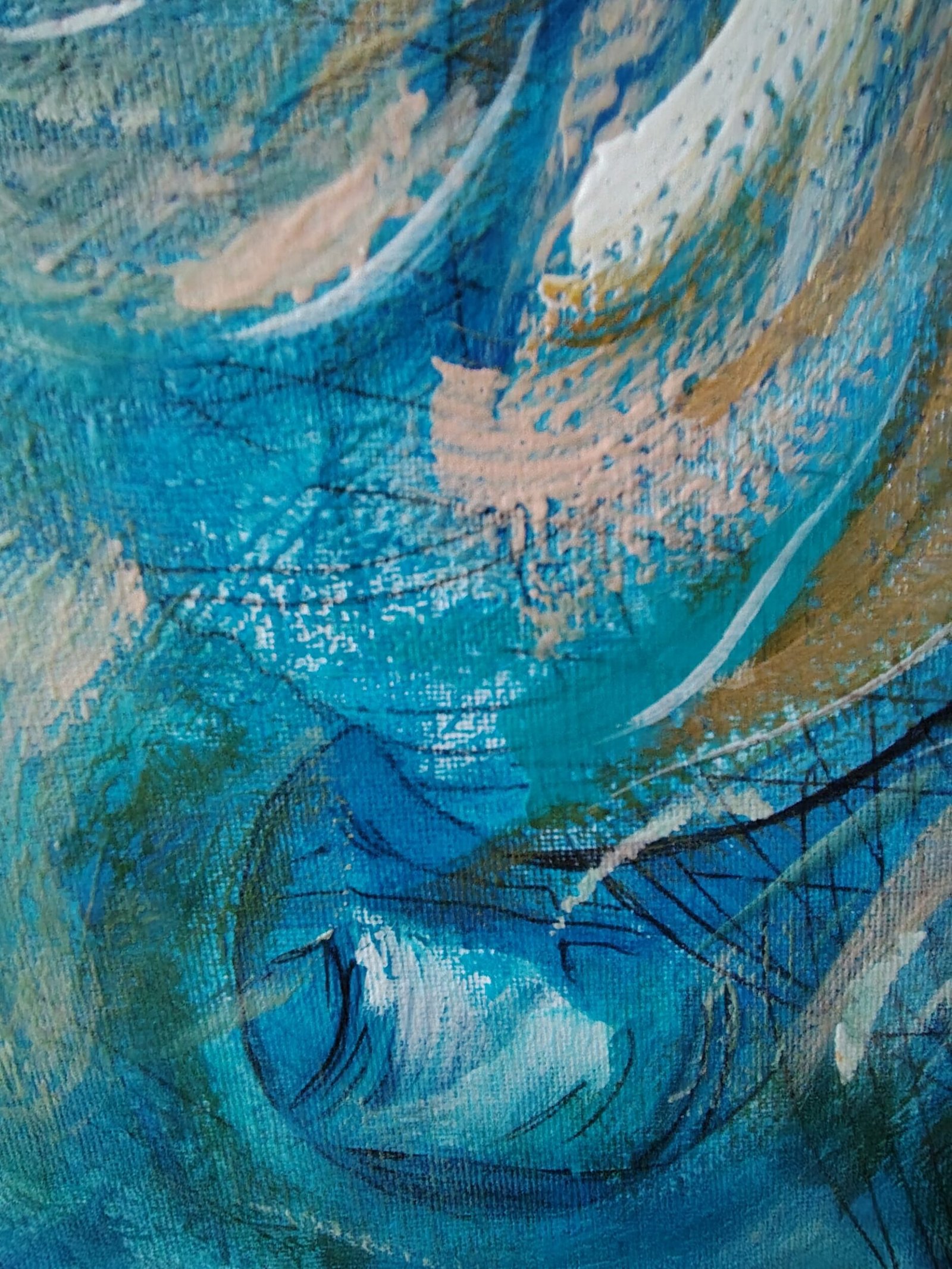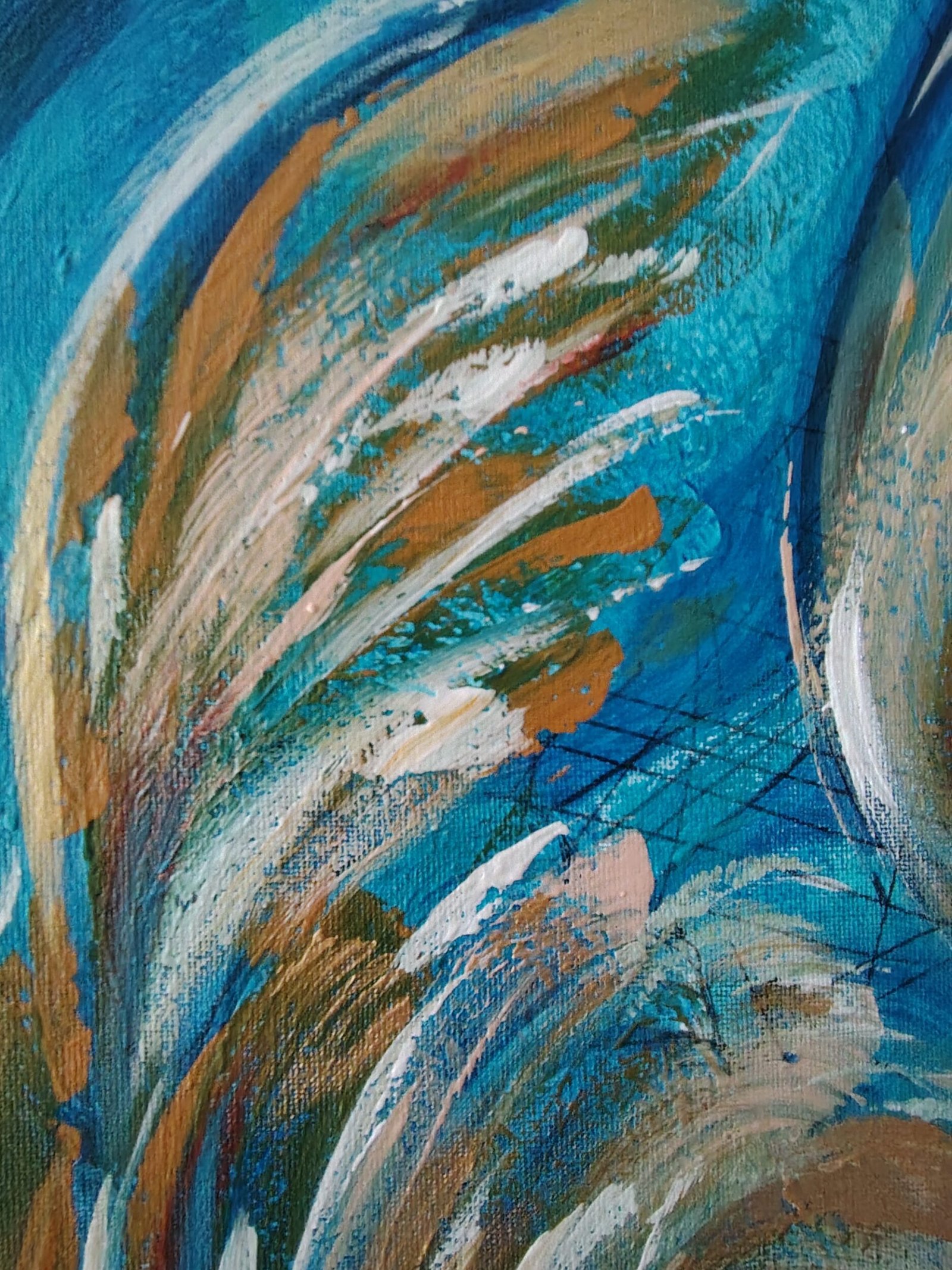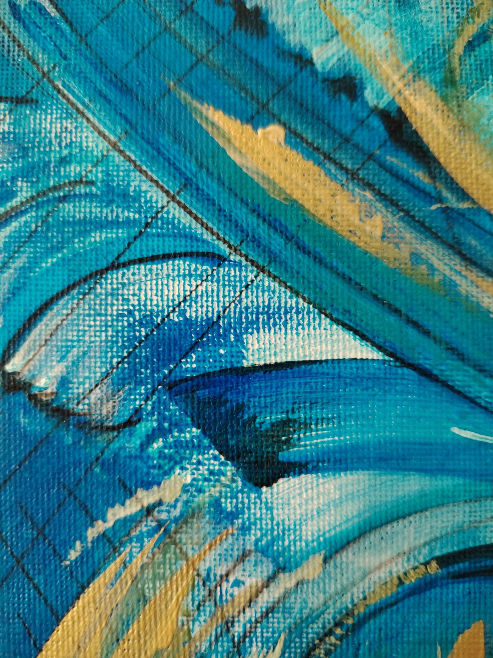 La obra se construye a través de trazos fluidos y capas cromáticas que generan dinamismo y profundidad. El diálogo entre tonos fríos y cálidos activa la superficie pictórica, reforzando una sensación de vitalidad, apertura y crecimiento continuo.