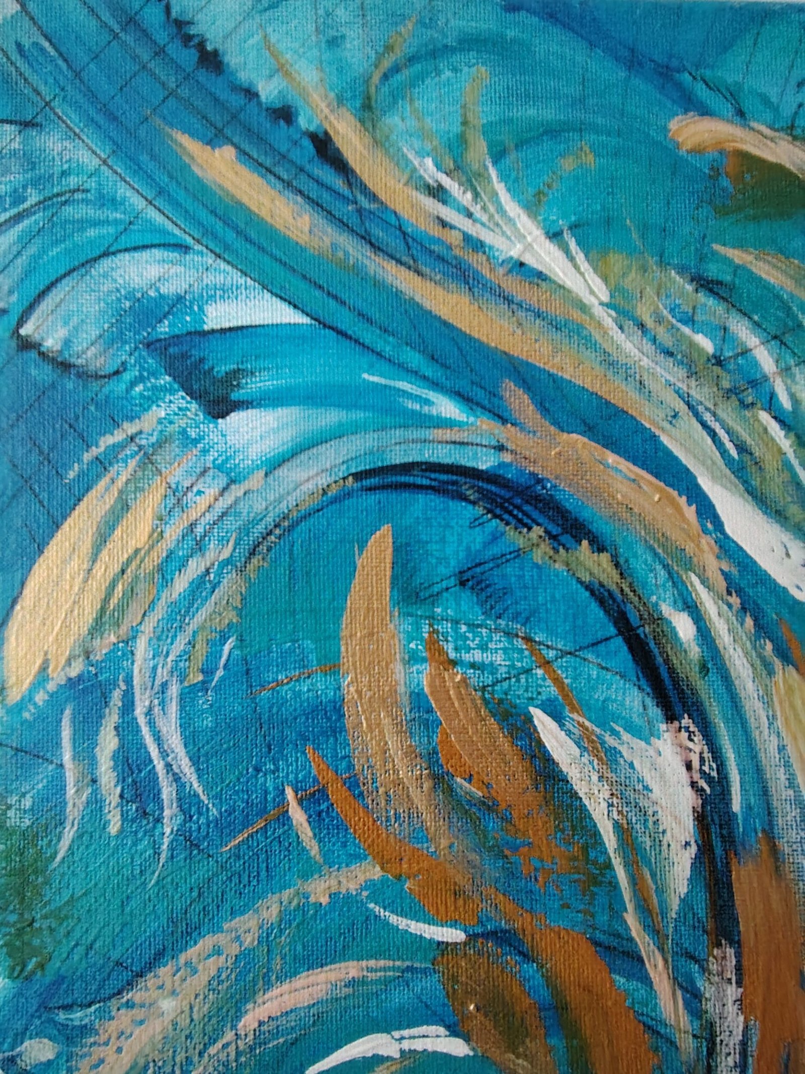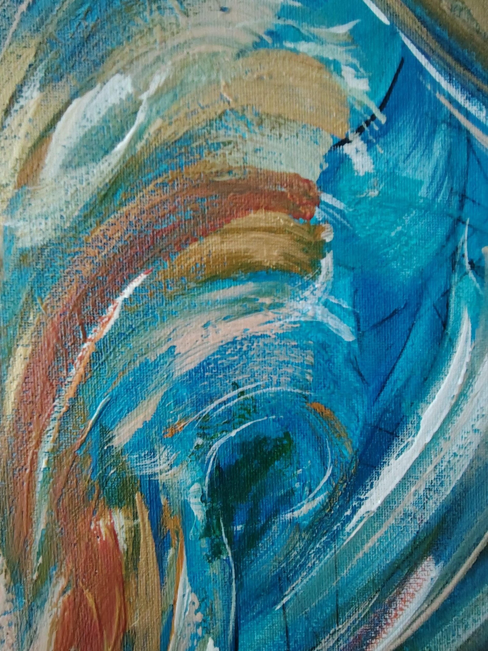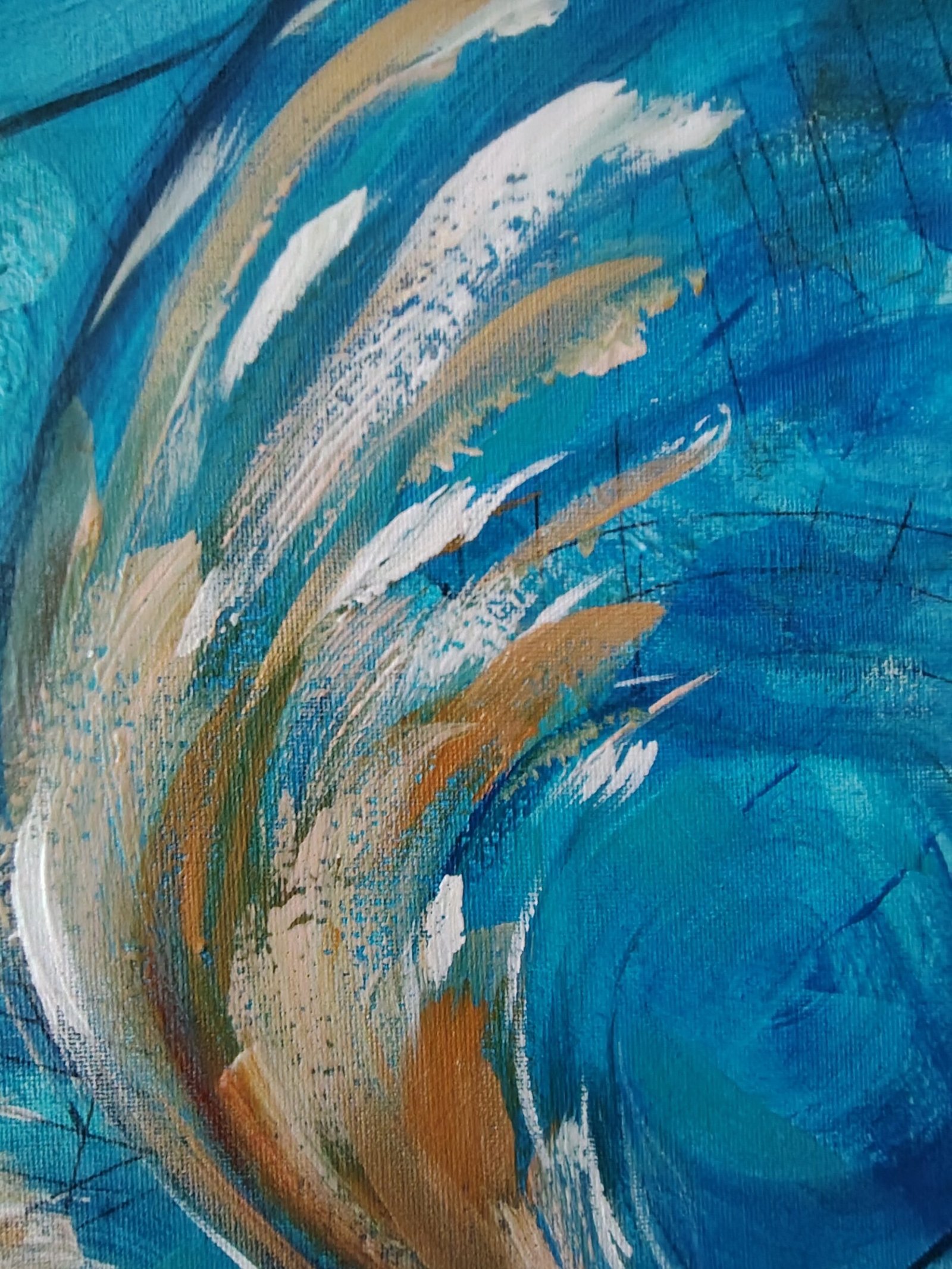 La obra se construye a través de trazos fluidos y capas cromáticas que generan dinamismo y profundidad. El diálogo entre tonos fríos y cálidos activa la superficie pictórica, reforzando una sensación de vitalidad, apertura y crecimiento continuo.