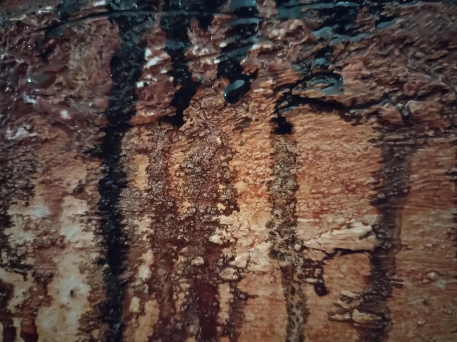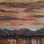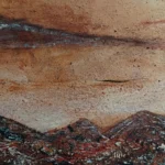 Las montañas aparecen como un horizonte contenido, casi suspendido, mientras la materia fluye hacia abajo en forma de escorrentías verticales. Este contraste entre estabilidad y caída introduce una tensión visual que invita a una contemplación pausada, más sensorial que narrativa.