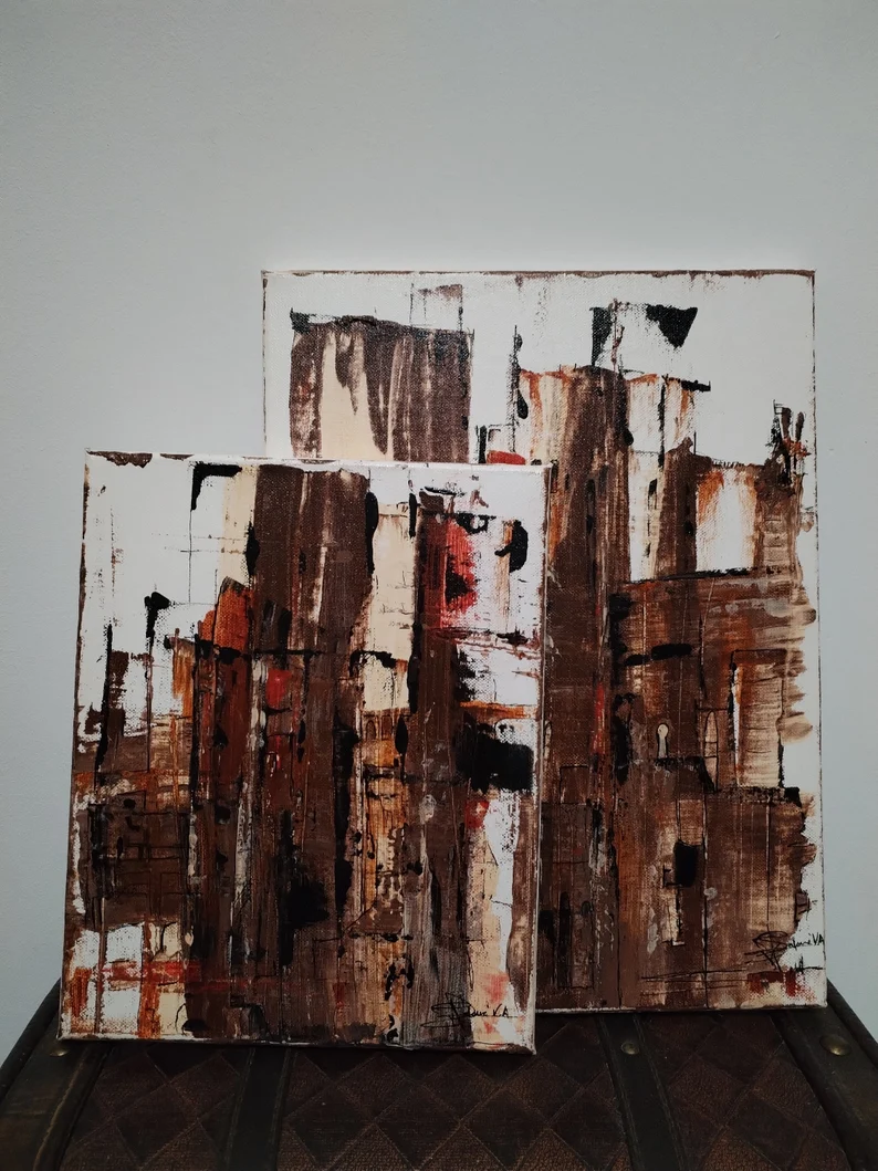 Díptico es una obra original compuesta por dos piezas que dialogan entre sí a través de la materia, la fragmentación y el ritmo visual. La obra explora la relación entre estructura y superficie, generando una lectura abierta y dinámica.