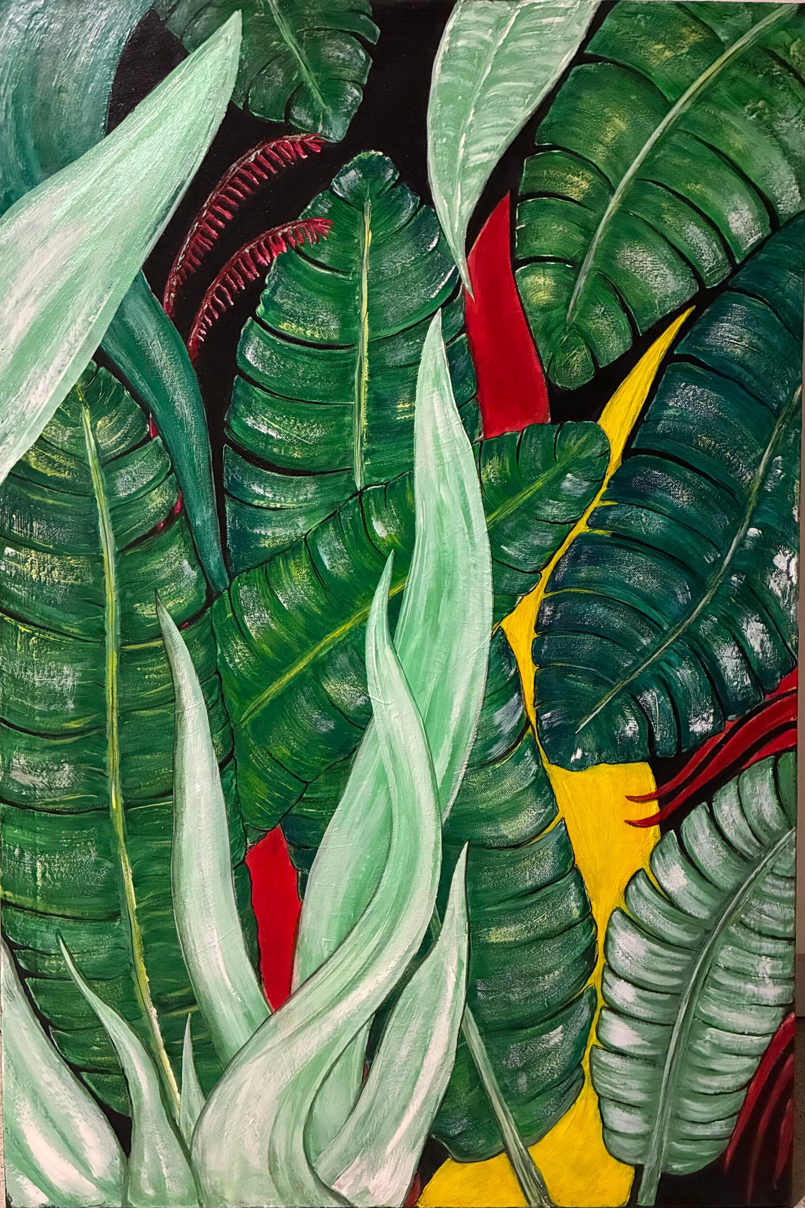 Tropical es una obra original de arte contemporáneo que explora la forma vegetal como estructura y presencia en el espacio. A través de la superposición de hojas y planos cromáticos, la pintura construye una composición dinámica donde la naturaleza se manifiesta como arquitectura viva.